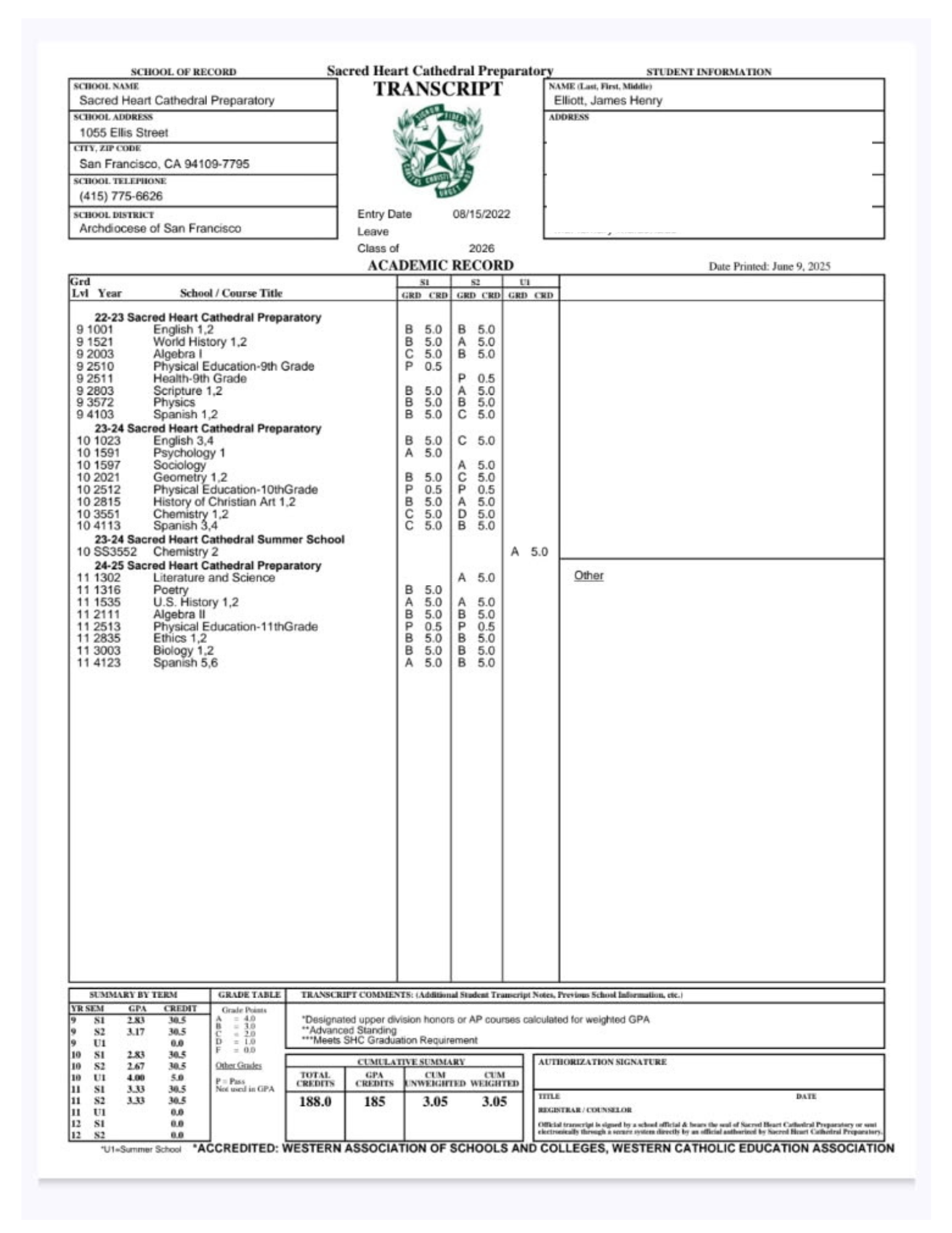 High School: Sacred Heart Cathedral Preparatory (CA.)
